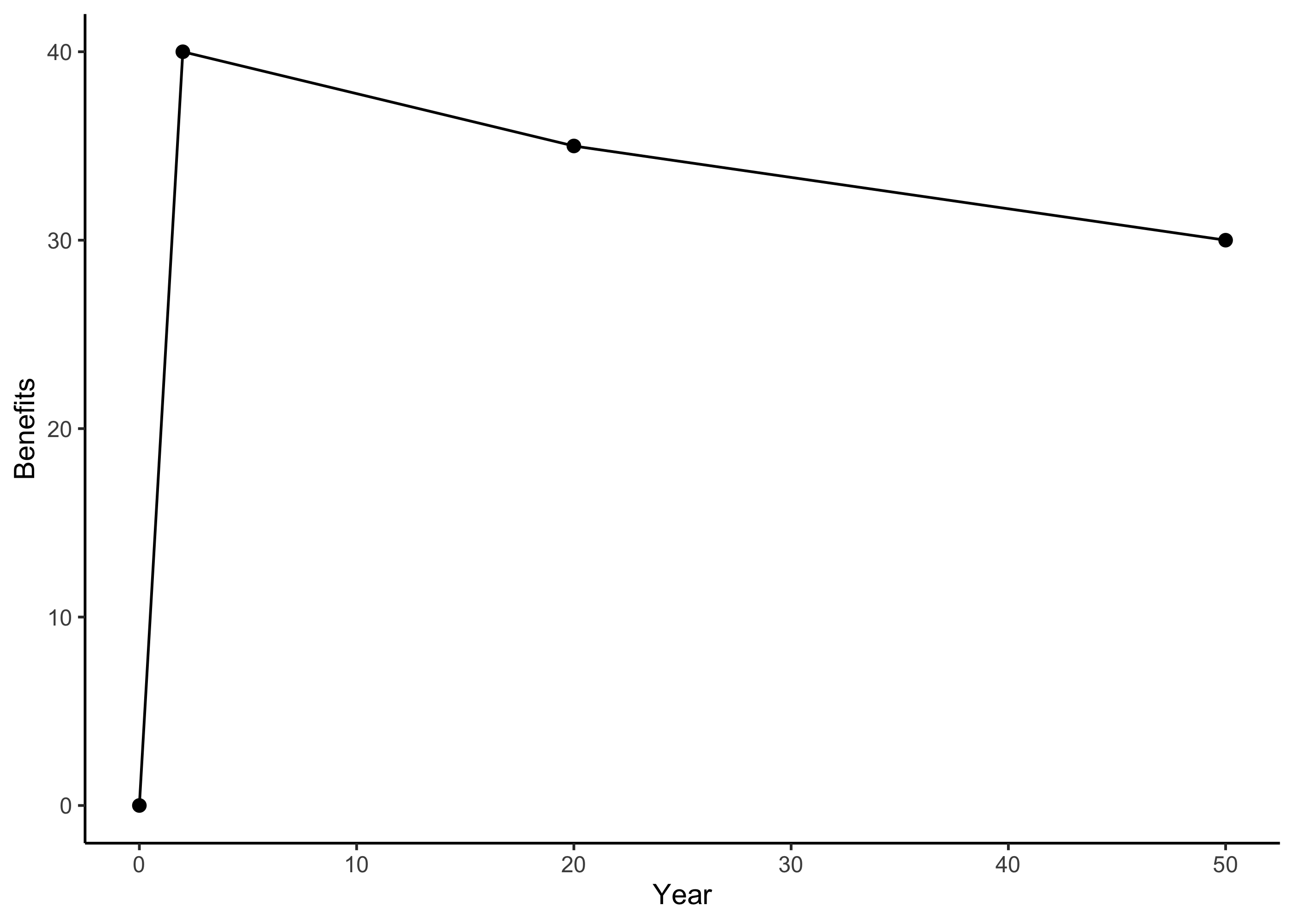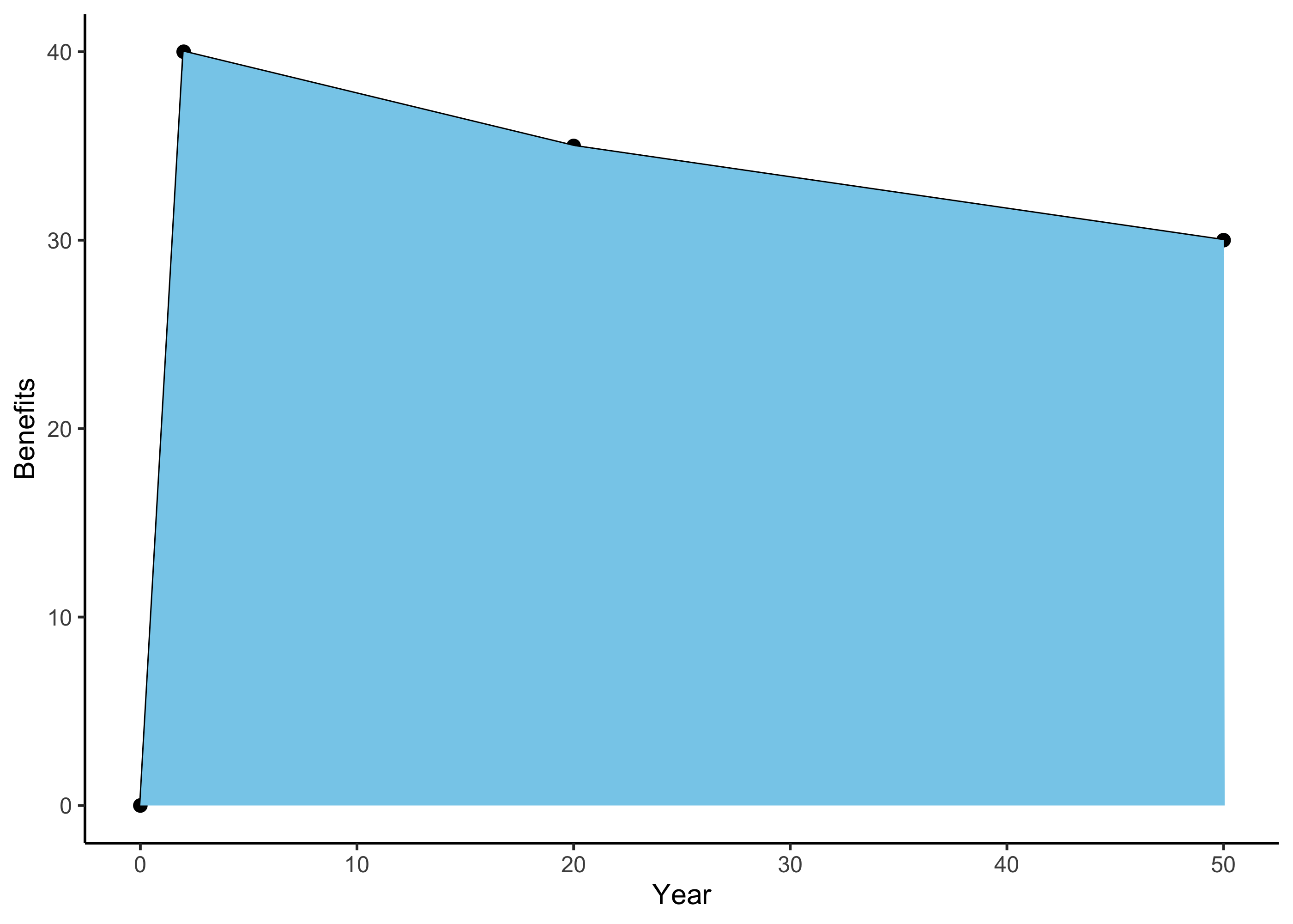 library(scales) # Needed to convert costs to dollars for table outputsLet’s imagine a simple scenario with ecosystem or restoration benefits calculated at four time periods from year 0 to year 50. We can store these benefits in a dataframe and plot them with ggplot as follows: