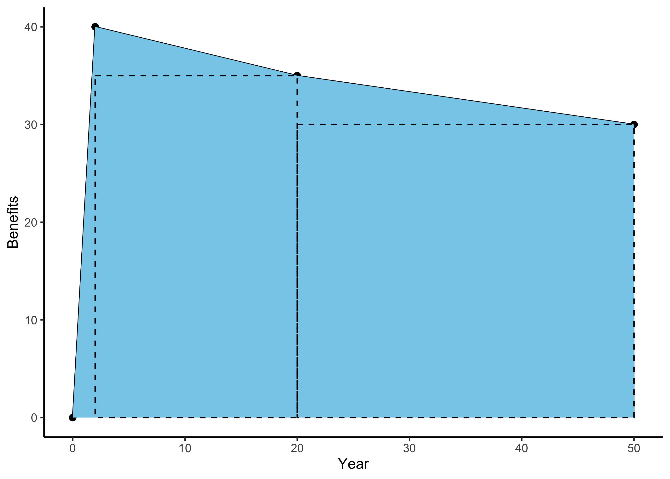 What annualization does is take the total shaded area under the benefits curve, and it divide by the number of years. This essentially looks like carving the area into triangles and rectangles, calculating the areas of these shapes and adding them together, and finally dividing to get an annual benefit. The df_rect code below simply creates a dataframe with the coordinates for two rectangles to add to our plot for visualization purposes.