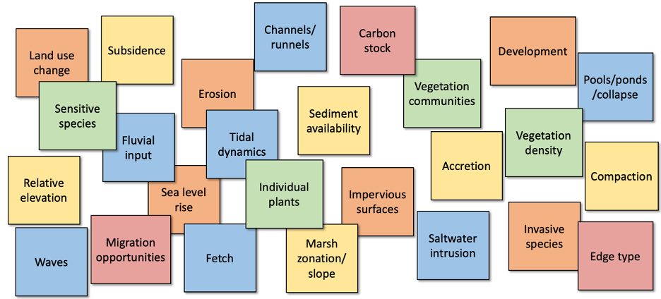 To start building the conceptual model, it can be helpful to start by identifying all the ecosystem components that may be relevant to the model. Any potentially important elements should be added at this stage. They can be removed later (and many will). Color coding by category (e.g., biochemistry, geomorphology, biology, etc.) can be helpful at this stage.