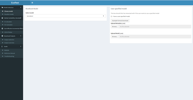 This section allows the user to select a model from either existing USFWS HSI “Bluebook Model” (left panel) or a “User-Specified Model” (right panel).