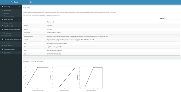 This section allows the user to verify the metadata and suitability plots of their chosen model. Once your model has been selected from available USFWS bluebook models or uploaded (user-specified), the metadata and suitability plots will appear as shown below.
