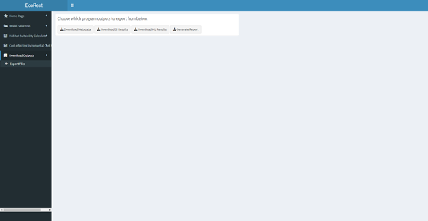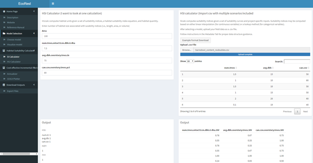 The ecorest webapp combines HSI and CEICA capabilities, package in ecorest, under a single graphical user interface. Users can access ecosrest data and functions without the need to use the R programming language. Below are the instructions on how to conduct HSI and CEICA using the ecorest webapp.