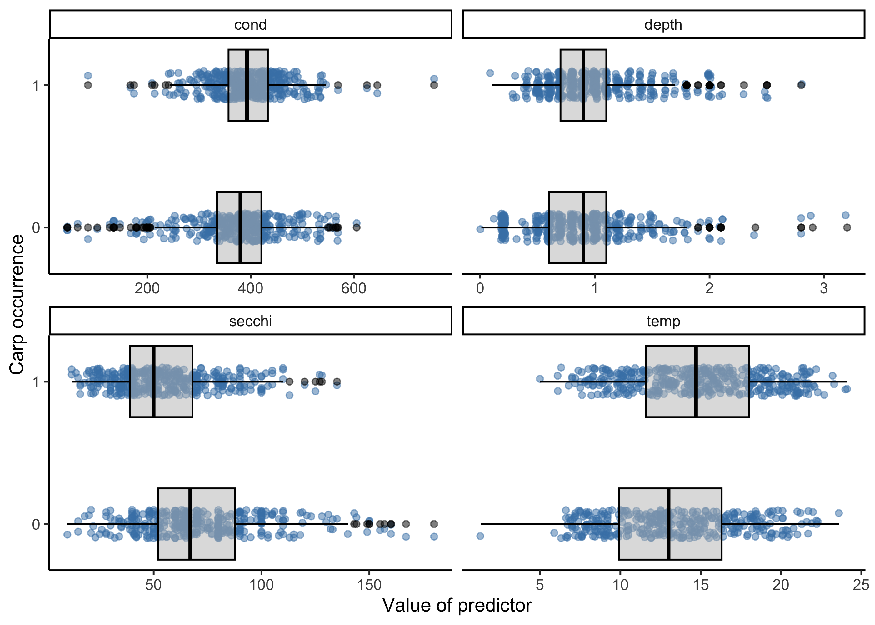 From these plots, a few variables pop out as being potentially important. For example locations with carp occurrences appear to have lower secchi disk readings (i.e., less clear water) and higher temperatures, but the strength of these relationships are unclear, which is where modeling comes in to play.
