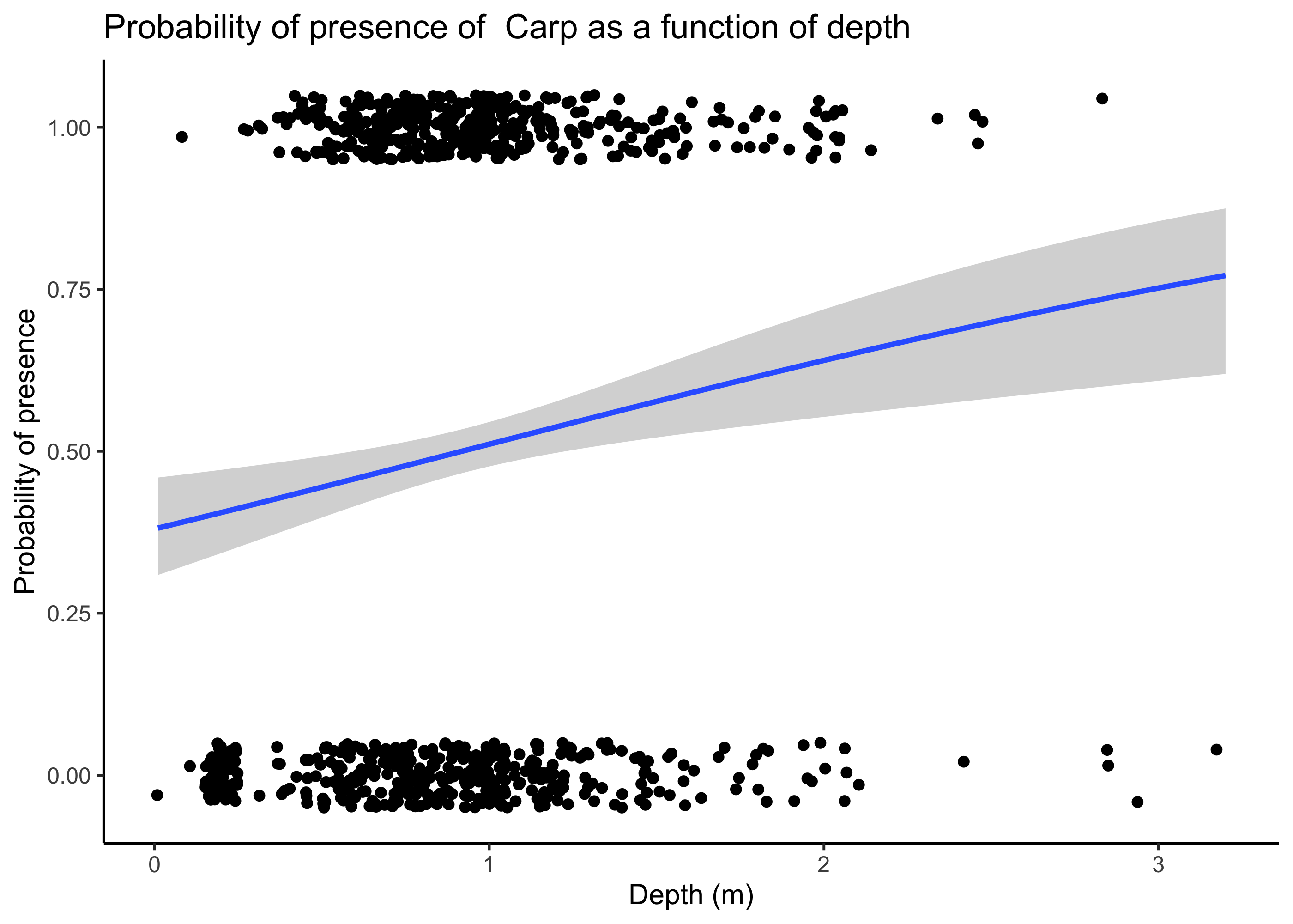 We can now use ggplot to generate a graph of these model results looking at the effect of depth on Carp occurrence probability. Note, however, that this is only approximate, as our model also included other parameters, and this plot merely considers depth.