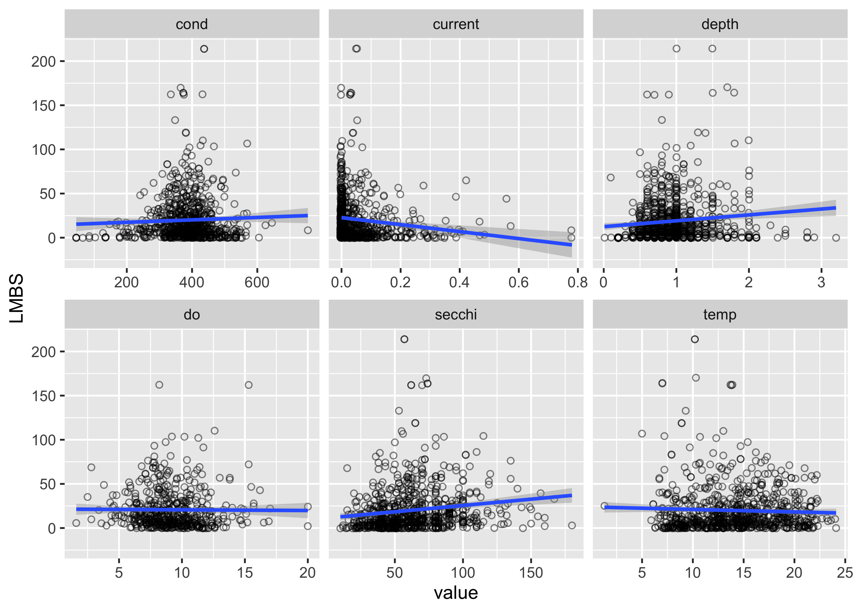 What if we want to model counts? For example, do we think counts of Largemouth Bass (LMBS) might change as a function of environmental predictors? We can first plot counts of LMBS as a function of predictors using ggplot.