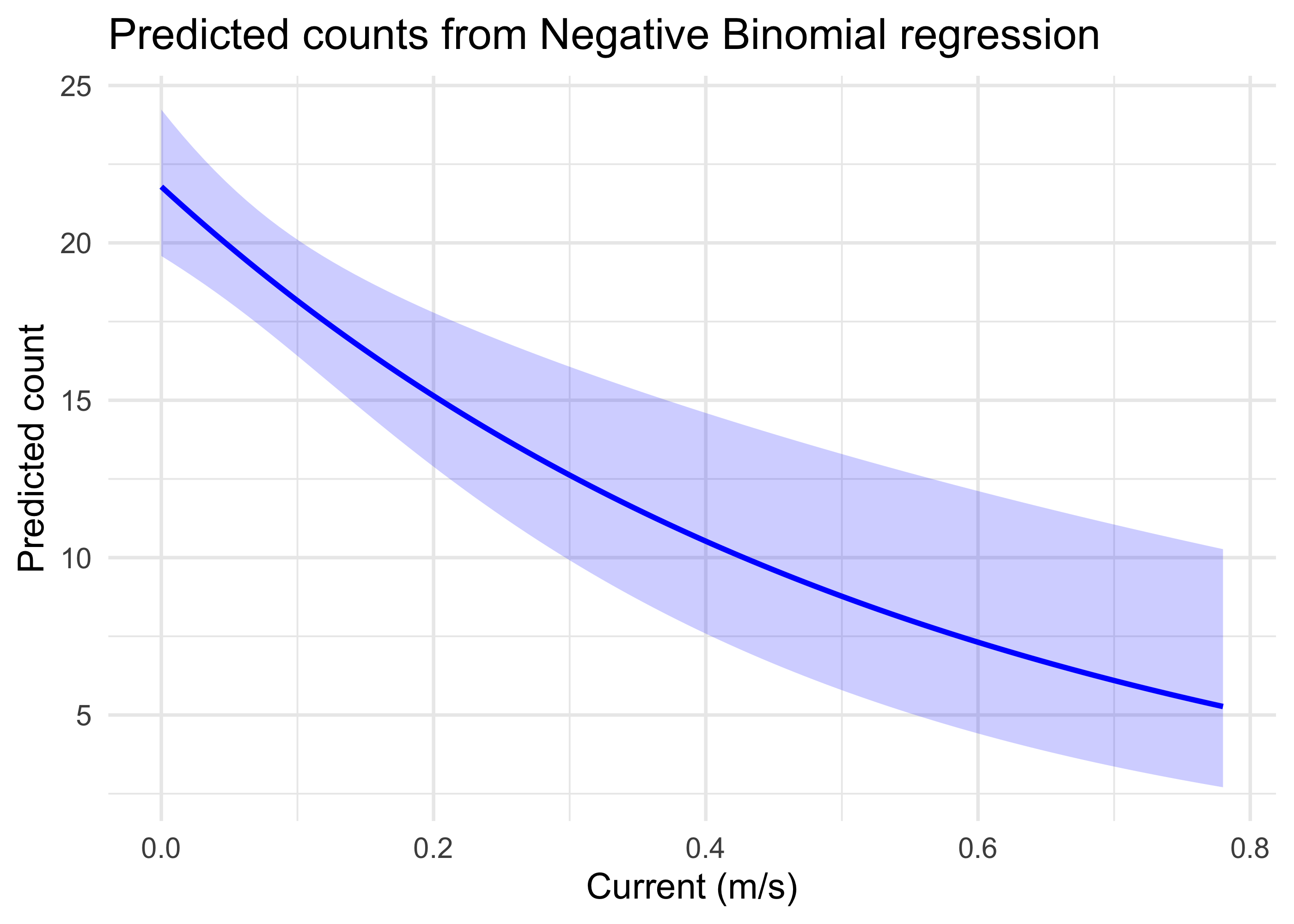 This indicates graphically that with the other predictors constrained to their mean values, largemouth bass counts are high when the water current is very low, but declines substantially and approaches low values as currents near 0.8 m/s.Similar plots could also be made for other predictors, and models could also examine whether there are meaningful interactions between predictors. These models could be used extensively to explore whether habitat models for species of interest reflect the empirical data in a system.