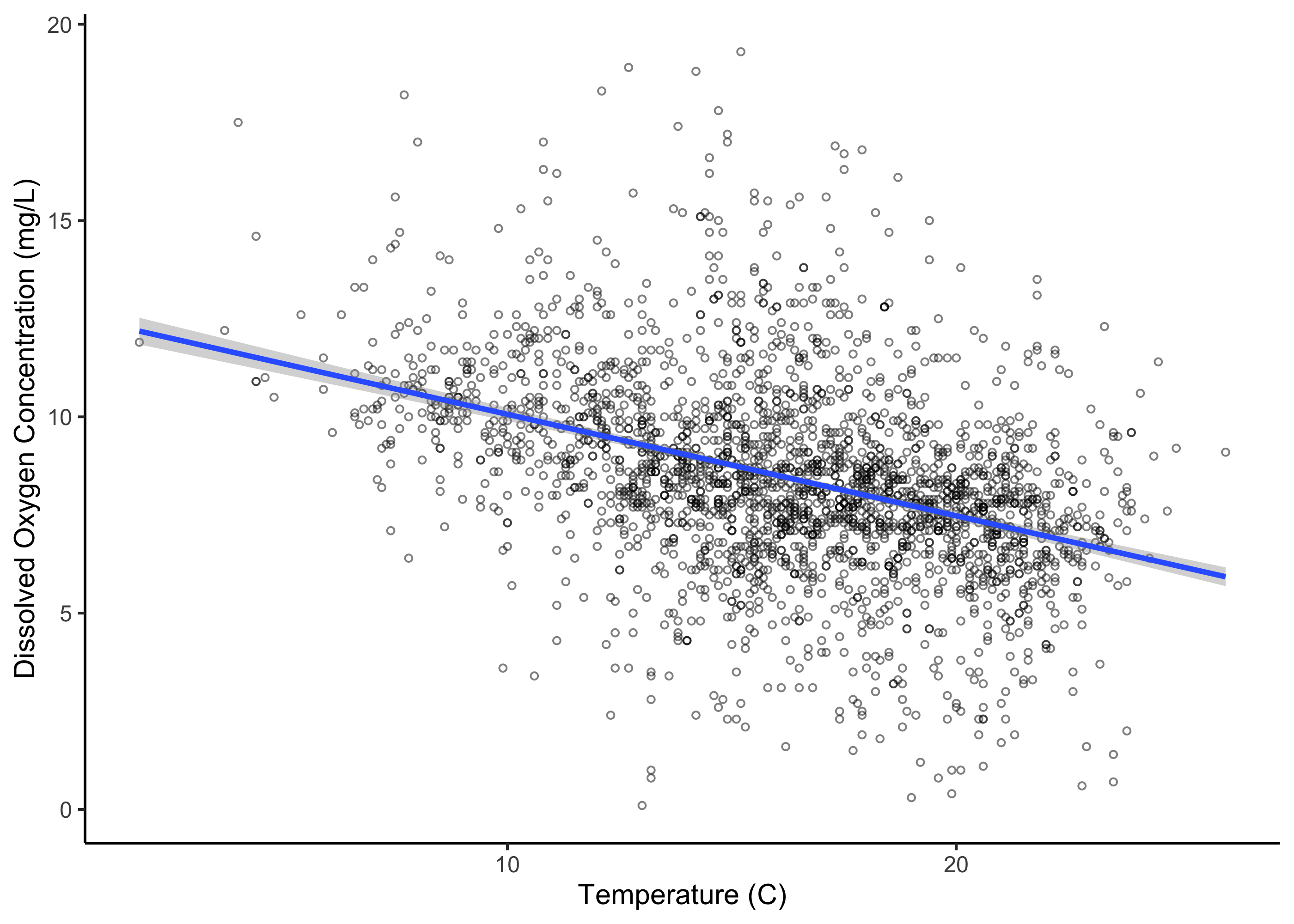 As an example, in aquatic systems, there is often a relationship between water temperature and dissolved oxygen concentration: the solubility of oxygen in water decreases as temperature increases, meaning that colder water is frequently more oxygenated. However, dissolved oxygen concentrations may also be affected by other factors like aquatic plants or water turbulence that can introduce oxygen to the water surface. Understanding these dependencies may be important for our ultimate goal of understanding what factors affect fish communities. To investigate this, we will use linear models in R.