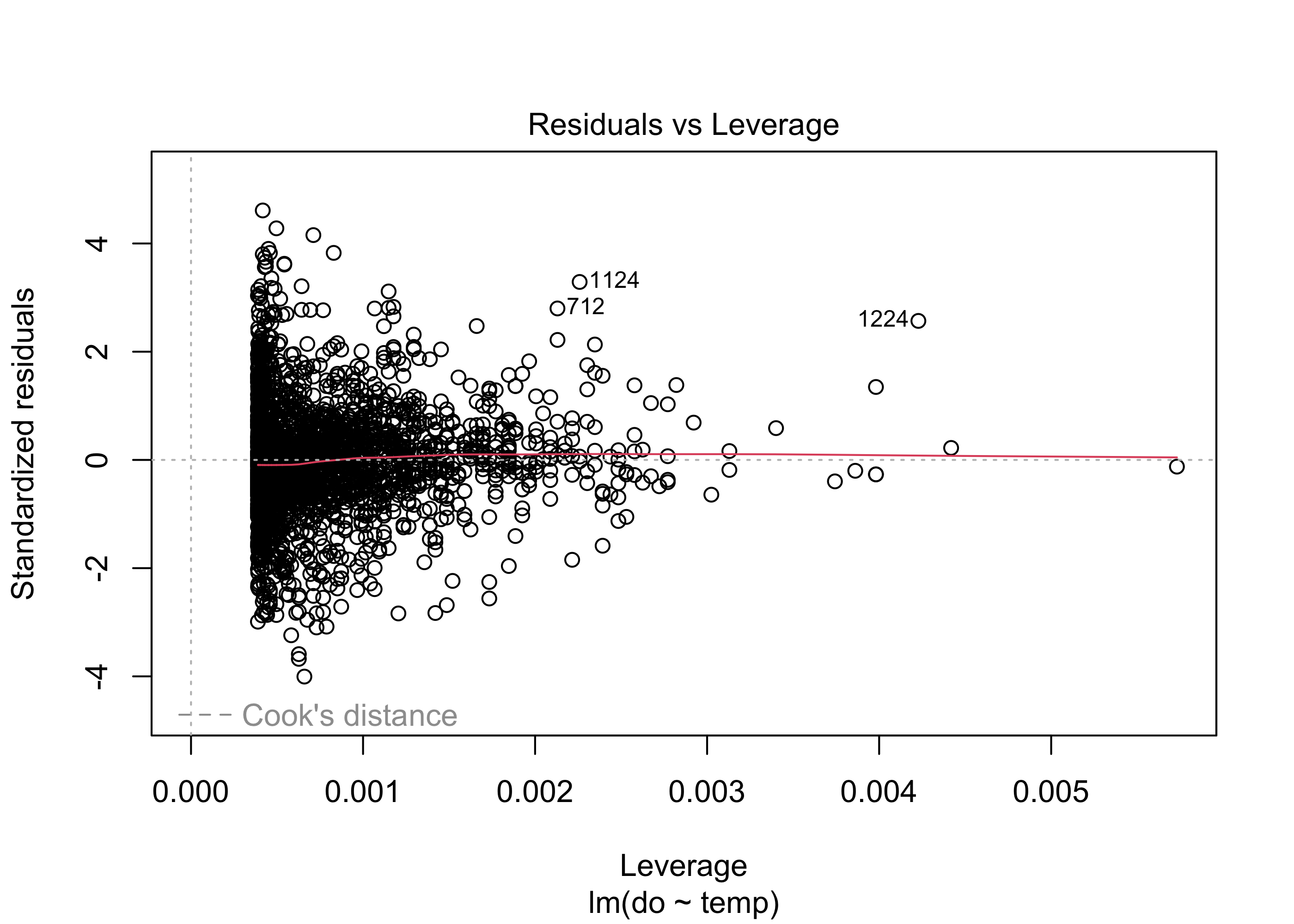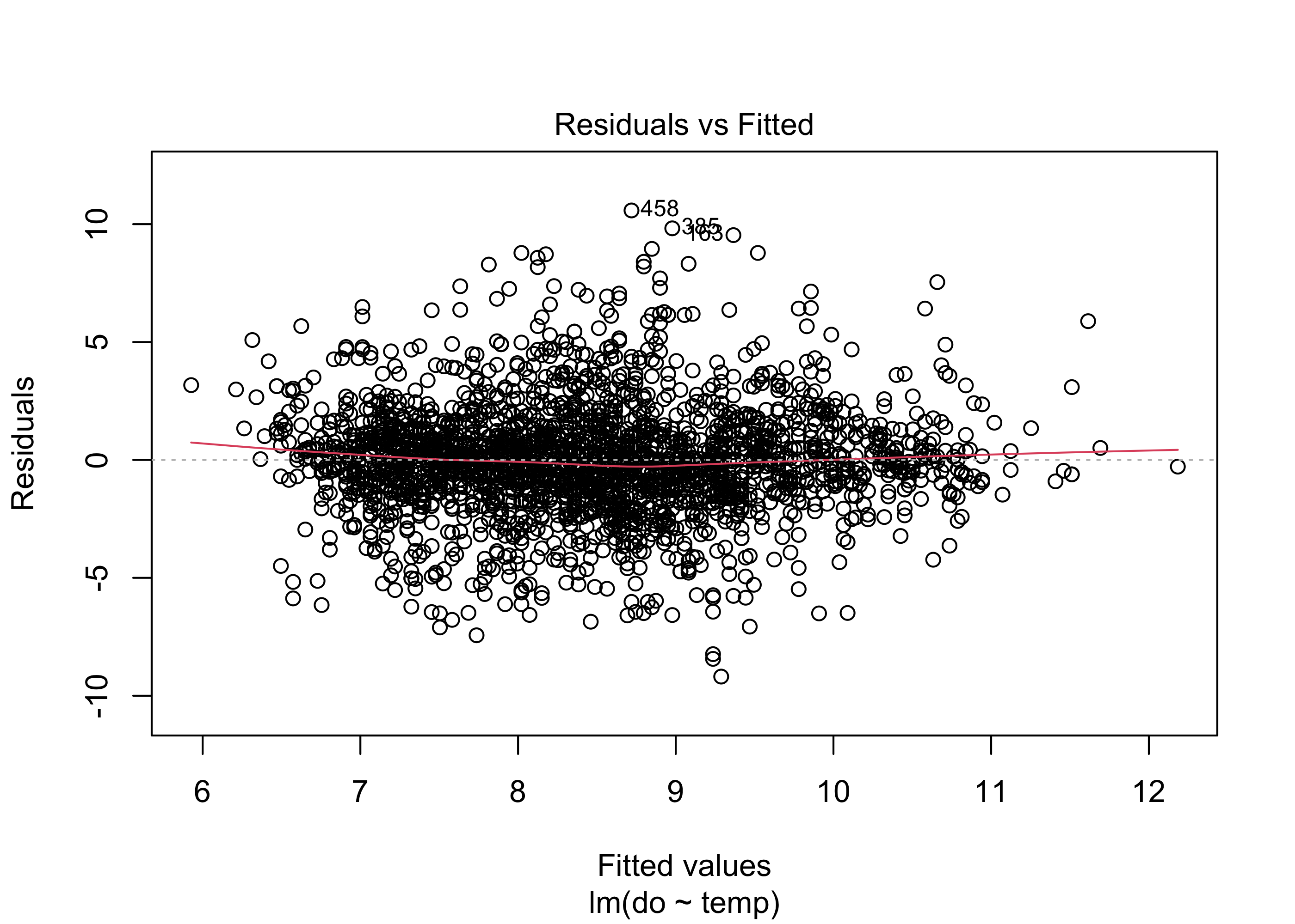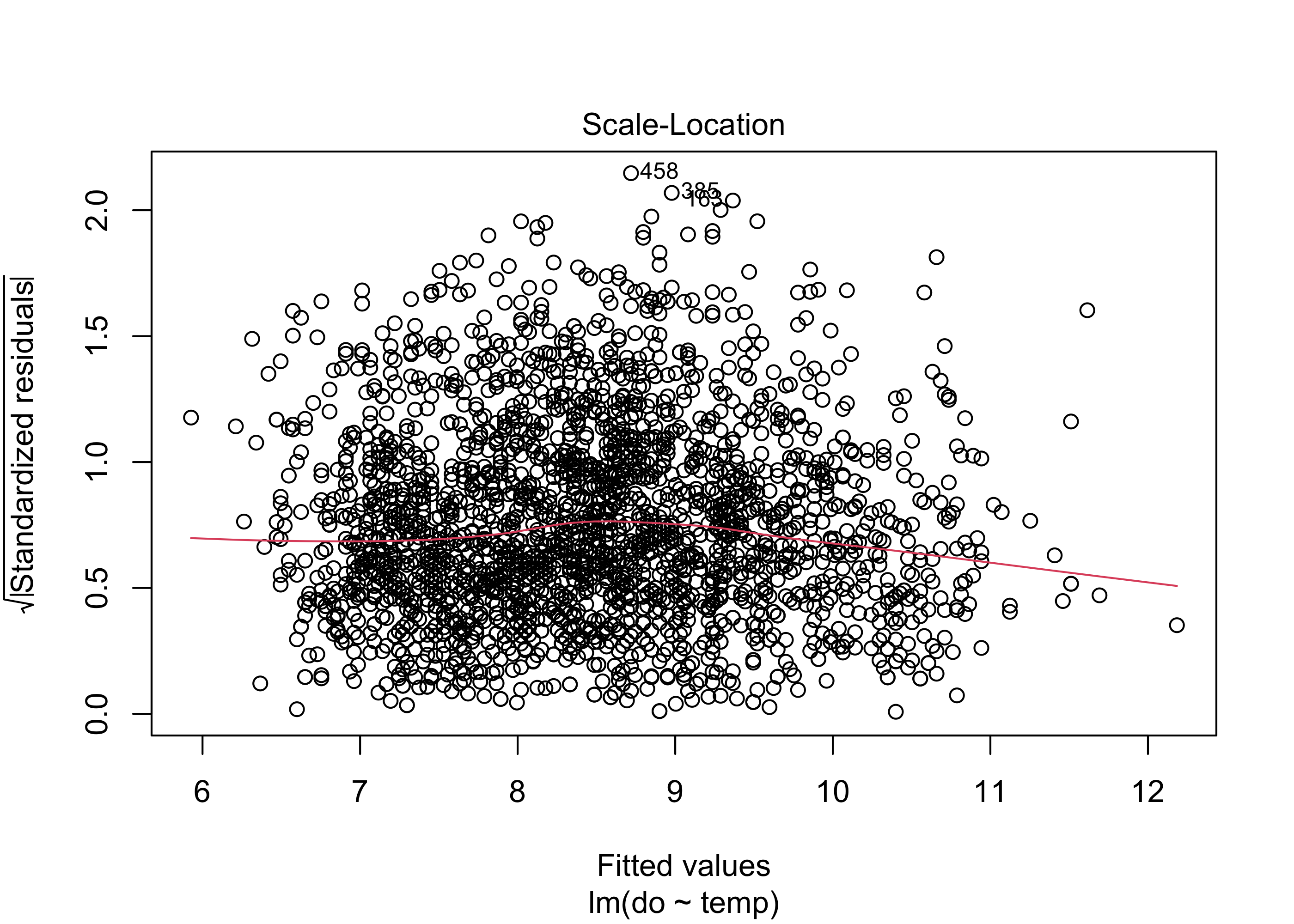 The first plot shows the Residuals vs. the Fitted values. Remember, the residuals are the difference between predicted values of the response variable (dissolved oxygen concentration here) and observed values of the response variable. If the model assumptions are met, this plot should have a horizontal line with residuals spread around it fairly evenly. If the residuals show non-linear patterns (e.g., a parabola) it may indicate a non-linear relationship between our predictors and our response variable. Here there appears to be fairly random scatter of residuals, suggesting no major problems with non-linearity.