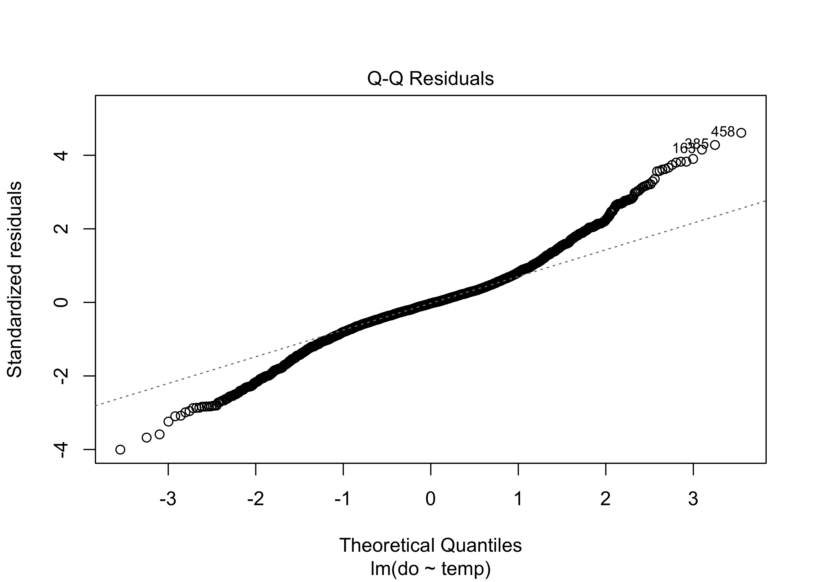 Taken together, these plots suggest that a linear model is a reasonable choice for assessing the relationship between temperature and dissolved oxygen concentration. Had our model violated the linear model assumptions more egregiously, we would need to use a different model type, often a generalized linear model, covered in the subsequent module.