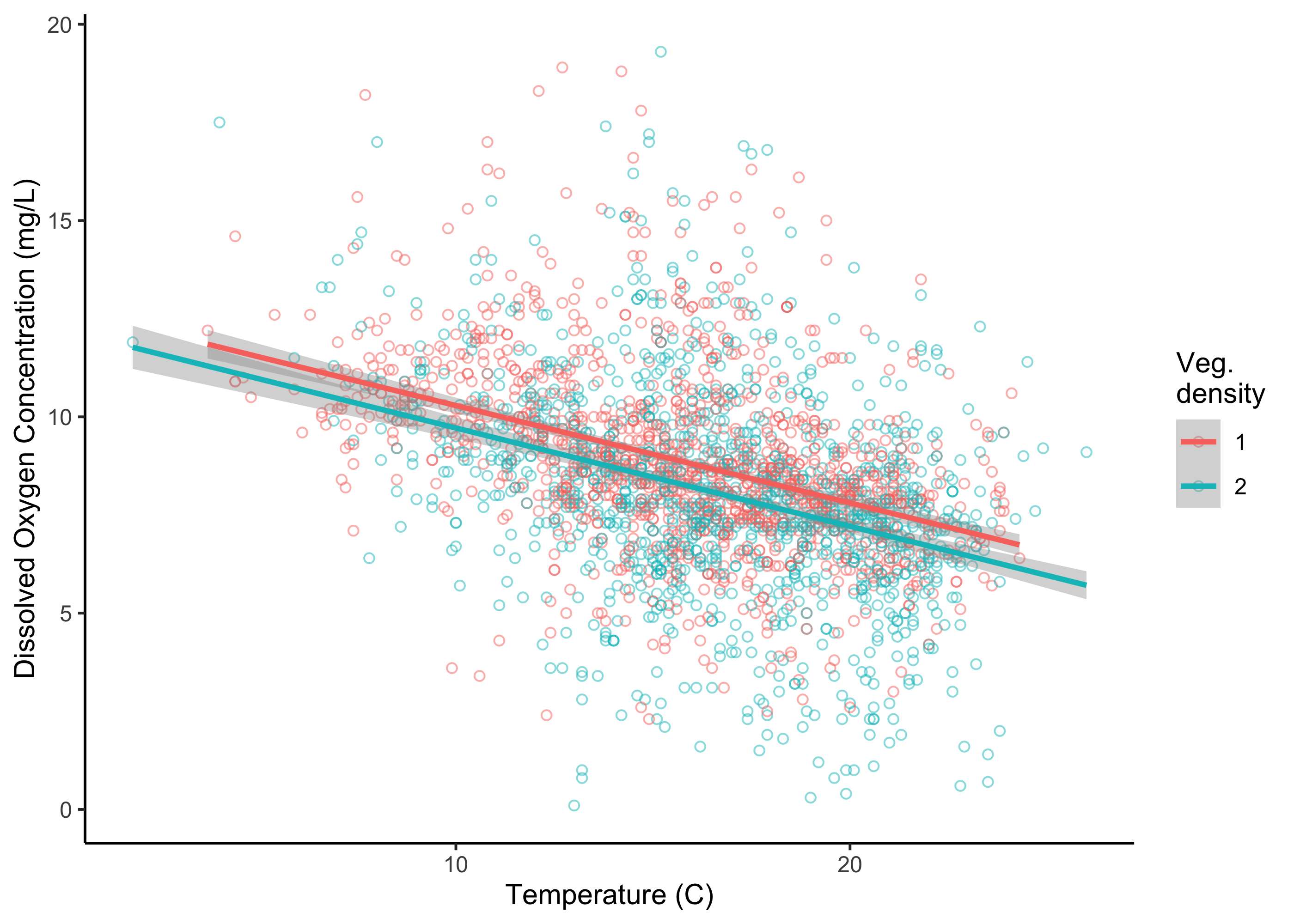 labs(x = "Temperature (C)", y = "Dissolved Oxygen Concentration (mg/L)", color = "Veg.\ndensity")+