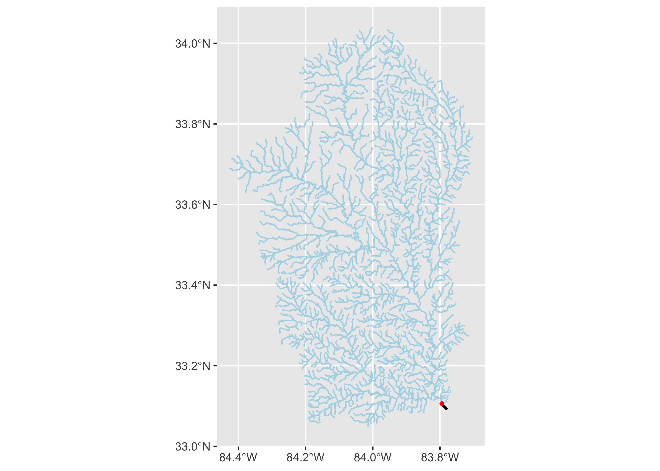 geom_sf(data = flowline_nldi$origin, linewidth = 1, color = "black")+